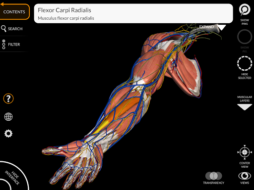 SIMPLE AND INTUITIVE INTERFACE • Rotate and zoom in each model in 3D space • Filter to hide or display each system • "Search" function to easily find every anatomical part • Option to hide or isolate each model • "Smart" rotation which moves the center of rotation automatically • Transparency function • Visualization of muscles through levels of layers from the superficial ones down to the deepest ones • Show/Hide UI interface (very useful with small screens)