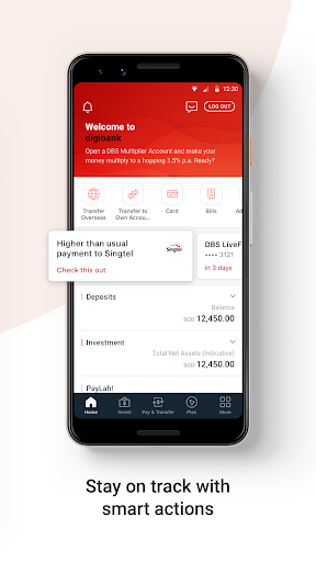 Use DBS digibank mobile to: PayNow and transfer money to anyone fast instantly. Transfer money overseas with DBS Remit: same-day transfers, $0 fees. See your accounts, cards and investments—all in one place. Verify your transactions securely with Digital Token. Peek at your account balance without logging in. View your transaction history and eStatements. Apply for accounts, loans and credit cards. Get an overview of your finances with personalised insights to achieve your financial goals Grow your savings in fixed deposits, unit trusts and ETFs. Protect yourself: buy general insurance and life insurance.. Reset your card PIN instantly and replace or block your card. Ask digibot about your account, transactions or to apply for a loan Set up digital token for a more secure and seamless mobile experience Access other services that let you Live more, Bank less.