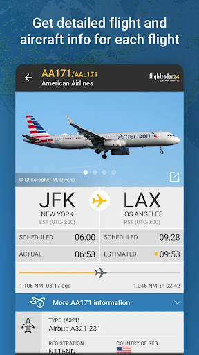 - Tap on a plane for flight details such as route, estimated time of arrival, actual time of departure, aircraft type, speed, altitude, high-resolution photos of the actual aircraft & more