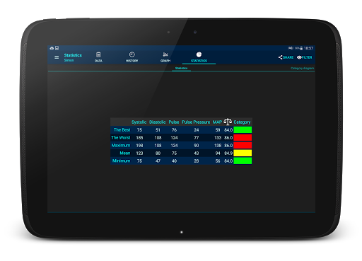 Key features: ★ Very friendly and easy in use user interface ★ Save, edit or update your measurement ★ Describe your records: ● Tags - write short descriptions and use them repeatedly ● Date and time of BP measurement ● The values (systolic, diastolic, pulse and weight) ● Description ★ Support for multiple users. ★ Interactive charts ★ Statistics and blood pressure factors ● MAP - Mean Arterial Pressure ● PP - Pulse Pressure ● 24h average ● Blood Pressure chart ● Cards with comparison of different time periods and factors ● and much more! ★ Export data: ● CSV ● PDF - detailed blood pressure reports ● blood pressure graphs and statistics from app ★ Reminders - helps to monitor blood pressure on a daily basis ★ Filters - unlimited possibilities in your hand. Decide what blood pressure data the application will show, analyse or export! ★ Appearance - Customise the appearance of the application to your needs ● Light and Dark theme ● Customizable colors for values of systolic, diastolic, pulse and weight. Especially useful for color blind users ★ Categories: Choose from various blood pressure standards like JNC7, JNC8, ESH/ESC, Isolated Hypertension, Hypotension ★ Backups all your blood pressure data, so no need to worry about loosing them