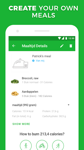 Virtuagym Food: Helping you to live healthy and feel great. Get a free personalized nutrition plan by answering a few questions about your lifestyle and goals. We support plans for many goals: weight loss, maintaining weight, weight gain and building muscle. Eat what you want, but keep an eye on those calories, carbs and fats!