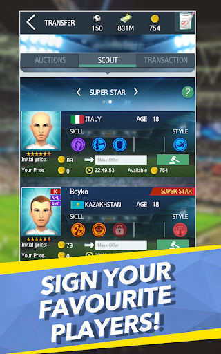 HUNT FOR STAR PLAYERS Hunt for players to meet your team’s needs. Bid against other soccer managers to win golden boys in the market, recruit all-stars with an agent, or use scouts to find young hopefuls you can make into tomorrow’s legends. Transfer players who no longer fit your strategy.