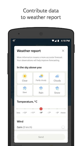 — View local weather forecasts and temperature for your current location and check out the weather in your favorite locations. — See what weather conditions to expect on a daily basis and view the forecast for the rest of the week. — Use gestures get more local weather information: swipe up on the main screen to see a daily forecast, swipe right to see hourly air temperature changes, and swipe left to see wind speed, humidity, and air pressure conditions. — The app offers home screen and notification panel widgets to help you quickly find what you need in Yandex or check the temperature outside. You can change the look and content of the widgets in the app settings. — Share your weather information with Yandex to help us provide you with the most accurate weather forecast.